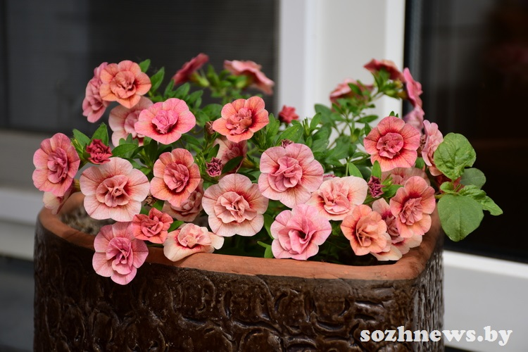 На подворье есть композиция в народном стиле: цветы в чугунках и глиняном кувшине.