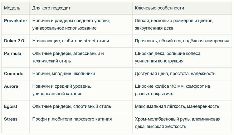 - Определите свой уровень и стиль катания: Для парк-стиля выбирайте лёгкие и манёвренные модели, для street — усиленные и устойчивые.