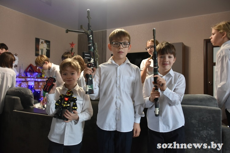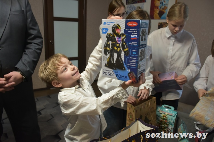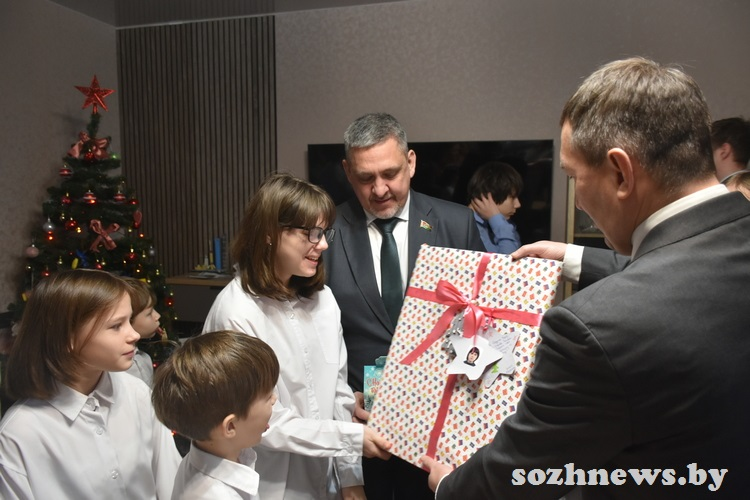 Подарки для подрастающих в семье Евмененко десяти мальчишек и четырех девчонок вручили глава района Александр Новиков и заместитель председателя Гомельского райисполкома Денис Давыдов. Здесь были и игрушки, и наборы для творчества, и гаджеты — все, что ребята написали на открытках для Дедушки Мороза и передали на установленную в райисполкоме елку.
