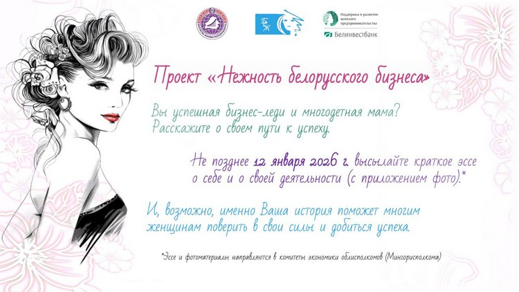 Одним из таких мероприятий является реализация Минэкономики совместно с ОО «Белорусский союз женщин» и ОАО «Белорусский банк развития и реконструкции «Белинвестбанк» проекта «Нежность белорусского бизнеса».