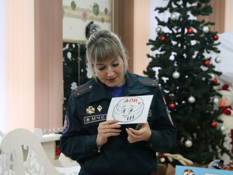 Работники МЧС рассказывали детям о безопасности дома и на улице. Особое внимание уделялось поведению вблизи водоемов в осенне-зимний период, а кошечка Даша помогала малышам разобраться с этими опасными ситуациями. Также огнеборцы напоминали алгоритм действий при выходе из задымленного помещения, номера, по которым можно вызвать спасателей.