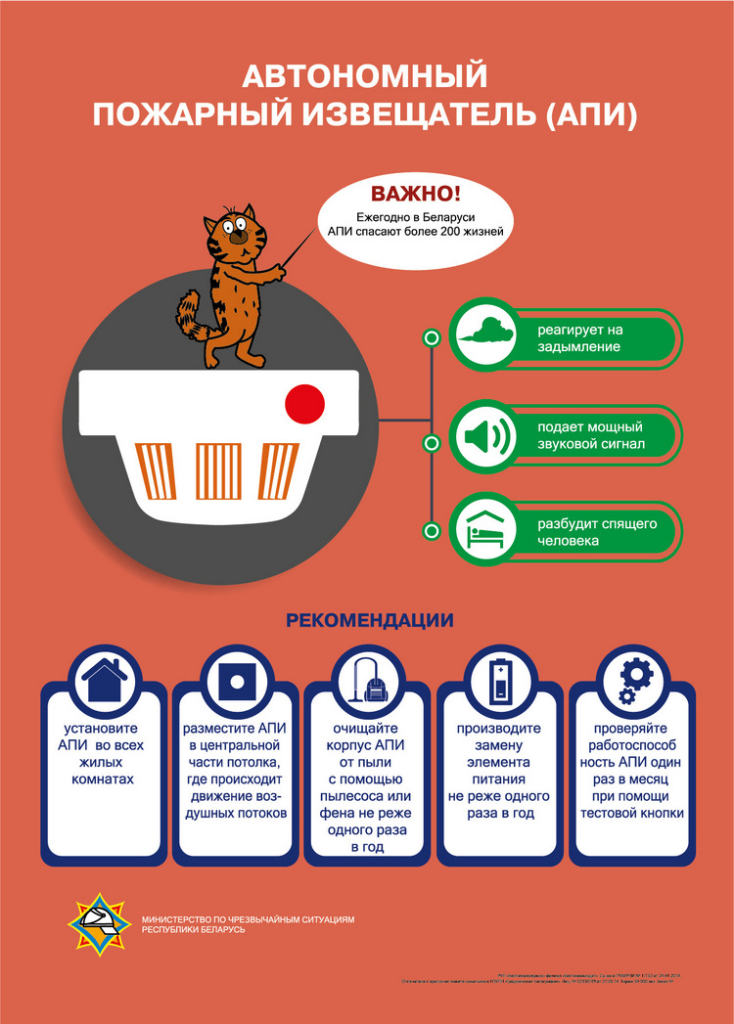 Внутри устройства находится специальный датчик, реагирующий на мельчайшие частицы дыма. Стоит лишь первой капельке появиться в воздухе — и извещатель начинает громко подавать сигналы тревоги, сообщая о приближающейся опасности. Устанавливать АПИ необходимо в каждой жилой комнате на потолке либо на стене от 10 до 30 сантиметров от потолка. Важно постоянно поддерживать его в рабочем состоянии и вовремя менять батарейку.