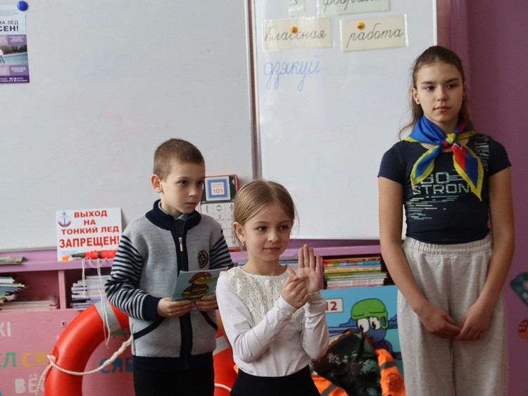 Игорь Корбут, председатель районной организации ОСВОД рассказывает школьникам о безопасном поведении вблизи водоемов, проигрывает ситуации вызова спасателей, если человек провалился под лед.