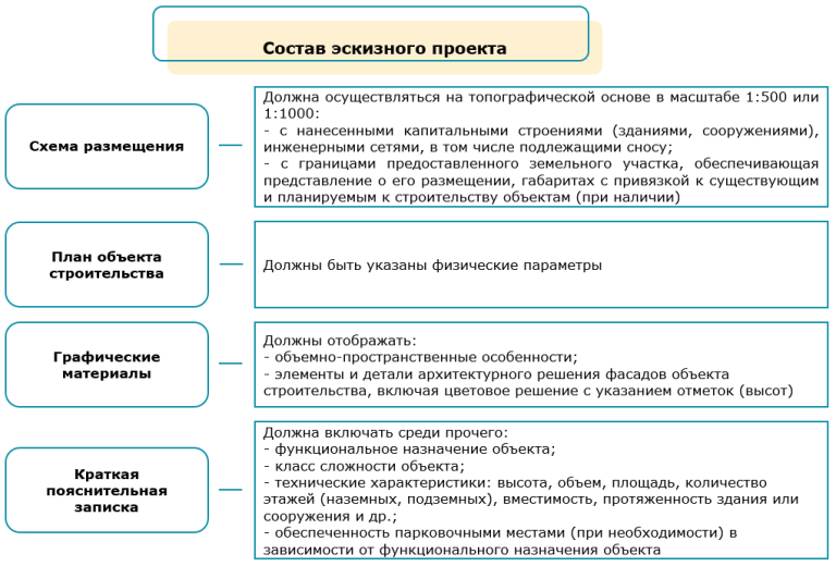 - составу эскизного проекта, который включает: схему размещения объекта, план объекта, графические материалы, краткую пояснительную записку.