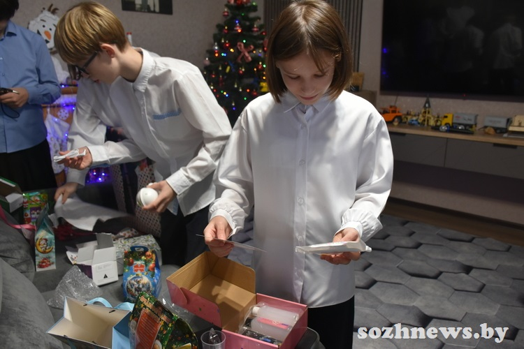 Подарки для подрастающих в семье Евмененко десяти мальчишек и четырех девчонок вручили глава района Александр Новиков и заместитель председателя Гомельского райисполкома Денис Давыдов. Здесь были и игрушки, и наборы для творчества, и гаджеты — все, что ребята написали на открытках для Дедушки Мороза и передали на установленную в райисполкоме елку.
