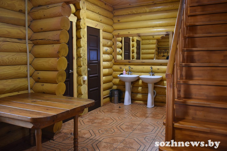Красивый экодом построен из оцилиндрованных сосновых бревен. Их специально не декорируют даже внутри помещения, сохраняя необычную атмосферу. А гости неизменно отмечают, какие красивые фото получаются на этом фоне.