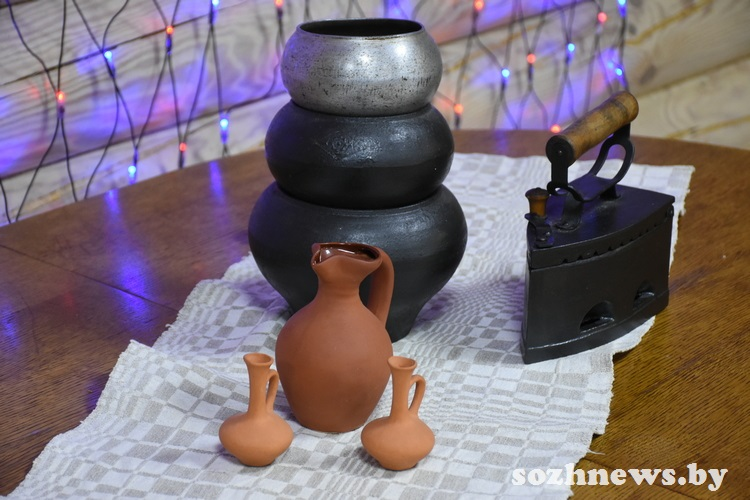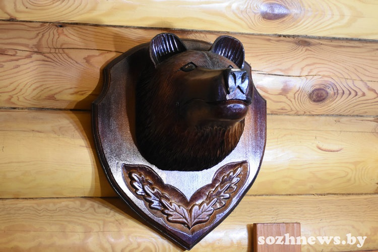 Рога оленей, лосей — это охотничьи трофеи Владимира Анатольевича, большого любителя охоты и рыбалки. Небольшой чугунок, который сейчас стал раритетом, Анне Михайловне достался от ее бабушки, пережившей Первую мировую войну и видевшей трагические события, которые разворачивались на сморгонской земле. А деревянного медведя, украшающего одну из комнат, хозяин заказал специально по образцу символического медведя на гербе Сморгони.