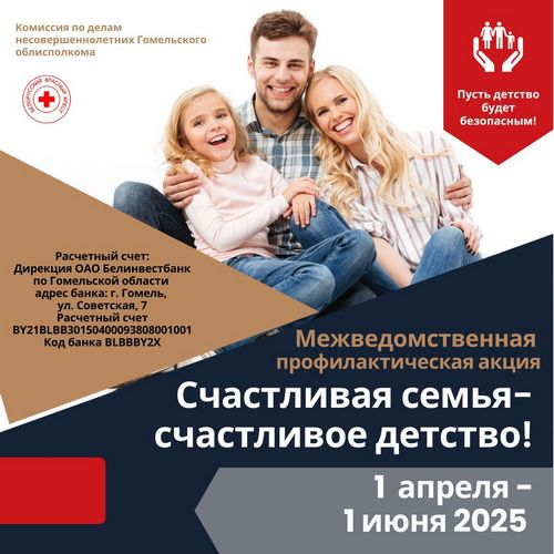 С 1 апреля по 1 июня по инициативе комиссии по делам несовершеннолетних Гомельского облисполкома в области будет проведена межведомственная профилактическая акция «Счастливая семья – счастливое детство!» с участием всех заинтересованных государственных органов, иных государственных организаций, общественных объединений.