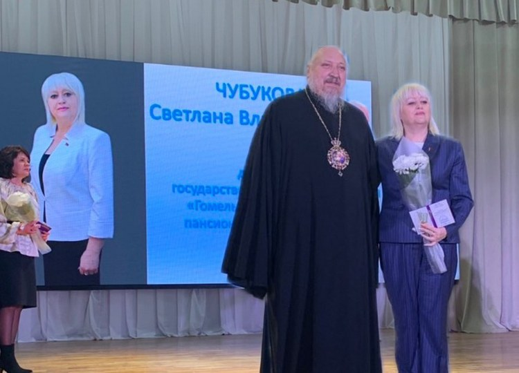 Епархиальную медаль Преподобной Манефы Гомельской архиепископ Гомельский и Жлобинский Стефан вручил директору учреждения «Гомельский пансионат социальный «Васильевский» Светлане Чубуковой.