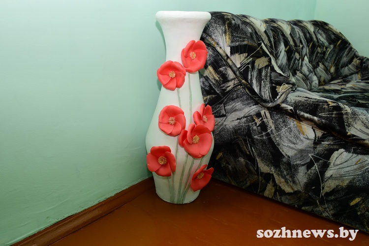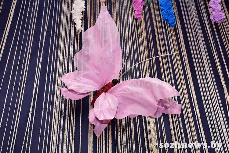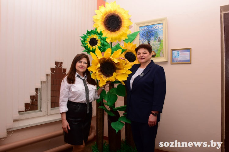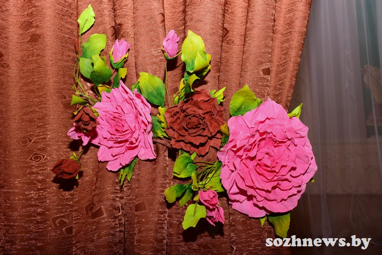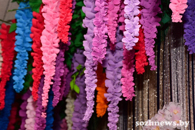 Огромные ростовые цветы из изолона, фоамирана, синтепона украшают школьные этажи. А к каждому празднику Рита Андреевна готовит особую фотозону, заботится об украшении актового зала. В канун 85-летия Поколюбичской средней школы придумала и создала оригинальную локацию для фото с целым водопадом глициний из фоамирана.
