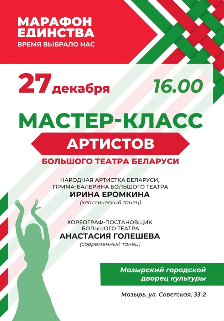 В рамках Марафона единства артисты Большого театра дадут дельные практические советы, выступив в ГДК. Мастер-класс по классическому танцу проведет народная артистка Беларуси, прима-балерина Ирина Еромкина, а по современному – хореограф-постановщик Анастасия Голешева.