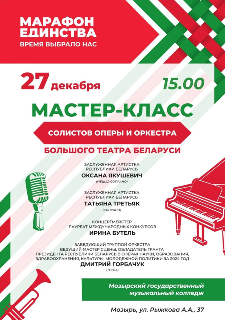 Солисты оперы и оркестра продемонстрируют свое мастерство в музколледже. Среди них – заслуженные артистки Беларуси Оксана Якушевич и Татьяна Третьяк, концертмейстер Ирина Бутель, заведующий труппой оркестра и ведущий мастер сцены Дмитрий Горбачук (труба).