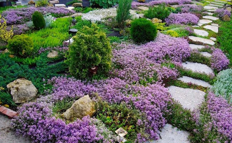 - Плюсы: ароматный ковер высотой 5 см, хорош в рокариях и на песчаных солнечных участках.