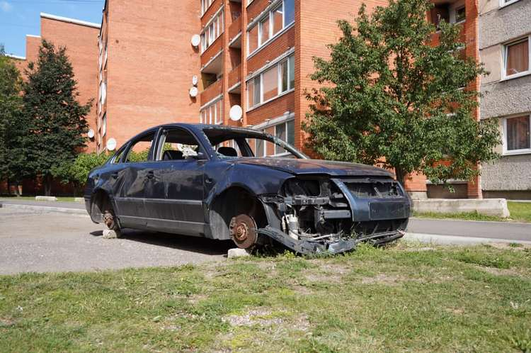 Брошенный автомобиль определить легко по следующим признакам: спущенные колеса, отсутствие деталей корпуса, грязь и другие следы длительного простоя.