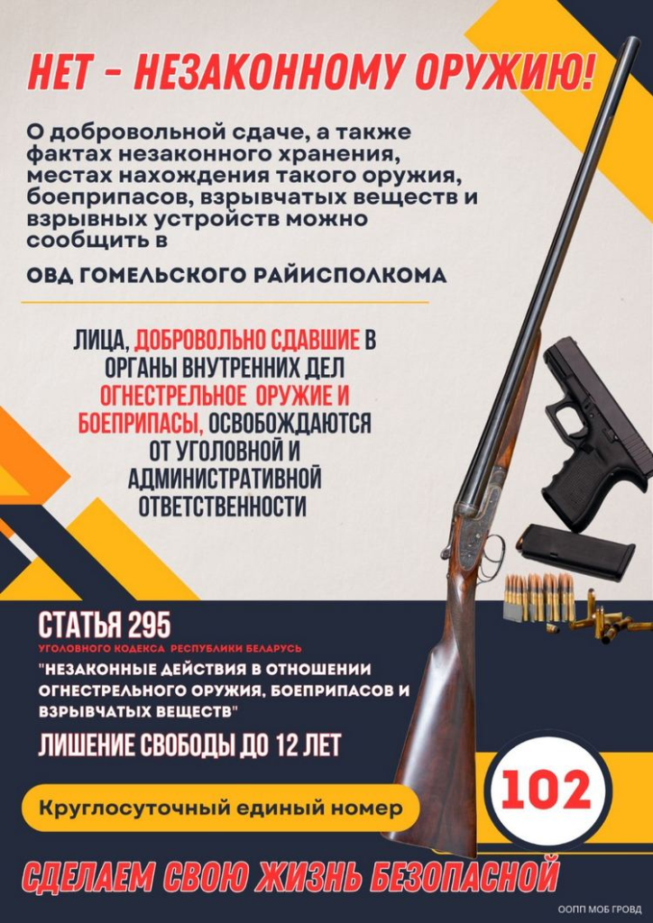 ОВД Гомельского райисполкома информирует: лица, добровольно сдавшие в органы внутренних дел огнестрельное оружие и боеприпасы, освобождаются от уголовной и административной ответственности.