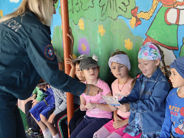 Работники МЧС повторяют с ребятами номера, по которым можно вызвать спасателей, говорят о безопасных местах для игр, а также вспоминают как правильно выйти из помещения, где есть дым.