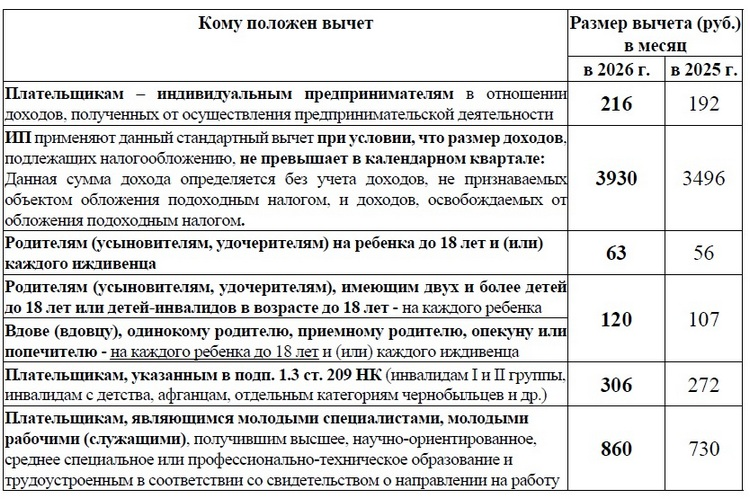 Инспекция МНС Республики Беларусь по Гомельской области информирует индивидуальных предпринимателей, что с 1 января 2026 года проиндексированы (увеличены) размеры стандартных налоговых вычетов, применяемых при исчислении подоходного налога с физических лиц.