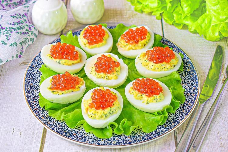 Фаршированные яйца с красной икрой и зеленым луком: роскошное украшение новогоднего стола