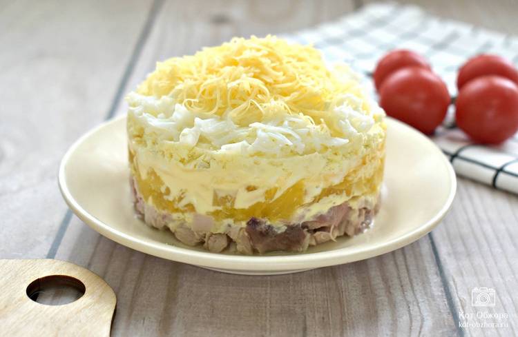 Оригинальный салат «Нежность» с курицей и ананасами на Новый год