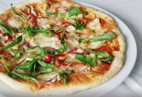 Приготовление: Нарезаем куриную грудку на небольшие кусочки и обжариваем их на сковороде с растительным маслом до готовности. Луковицу и перец режем на небольшие кусочки и обжариваем их вместе с курицей. Тесто для пиццы кладем на противень и обмазываем его томатным соусом. Распределяем поверх соуса нарезанную курицу, лук и перец. Кладем сверху моцареллу и выпекаем пиццу в духовке при температуре 220 градусов около 15 минут или до золотистой корочки.