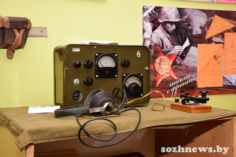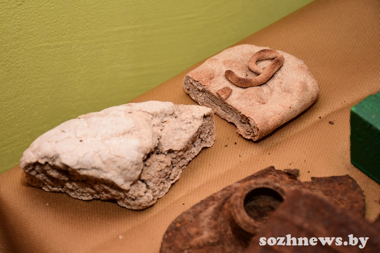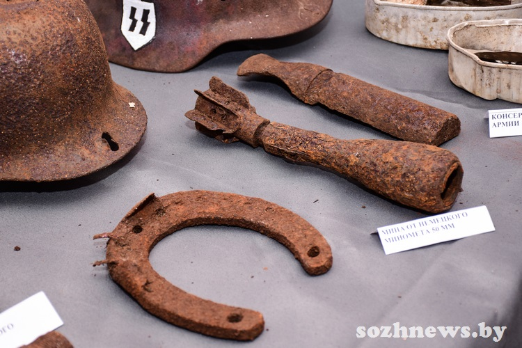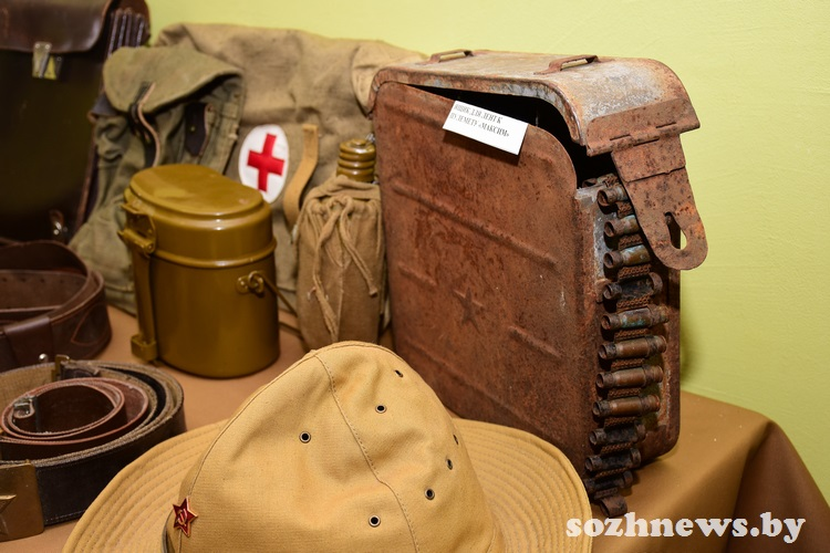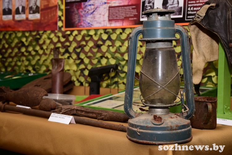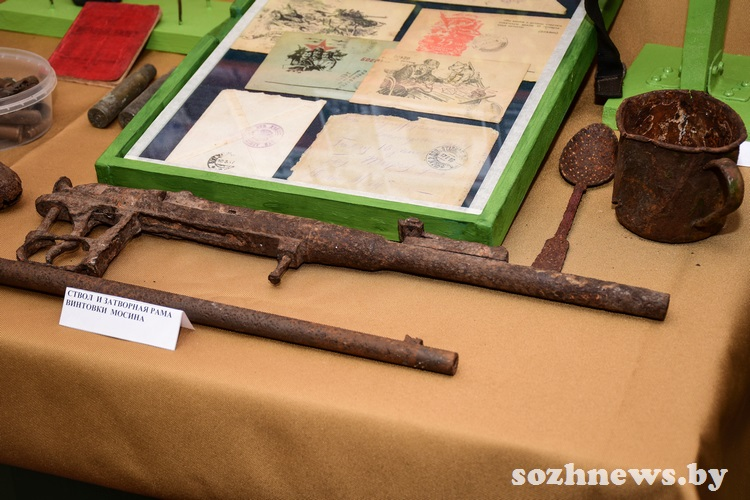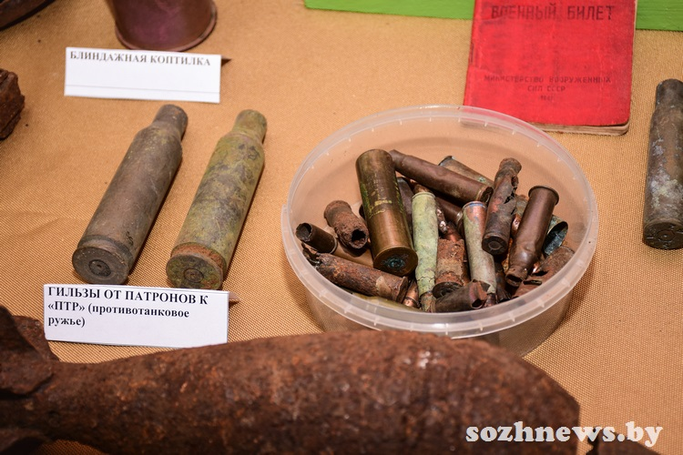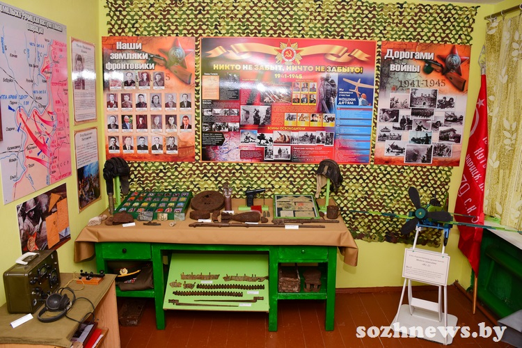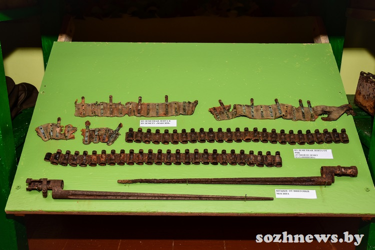 Экспонаты, найденные при раскопках мест былых сражений, — это подарок от профессиональных поисковиков. В музейной комнате можно увидеть, например, пулеметный диск ДП (ручного пулемета, разработанного Василием Дегтярёвым, — одного из первых образцов стрелкового оружия, созданного в СССР), диск пистолета-пулемета системы Шпагина, мины, саперную лопатку и многое другое.