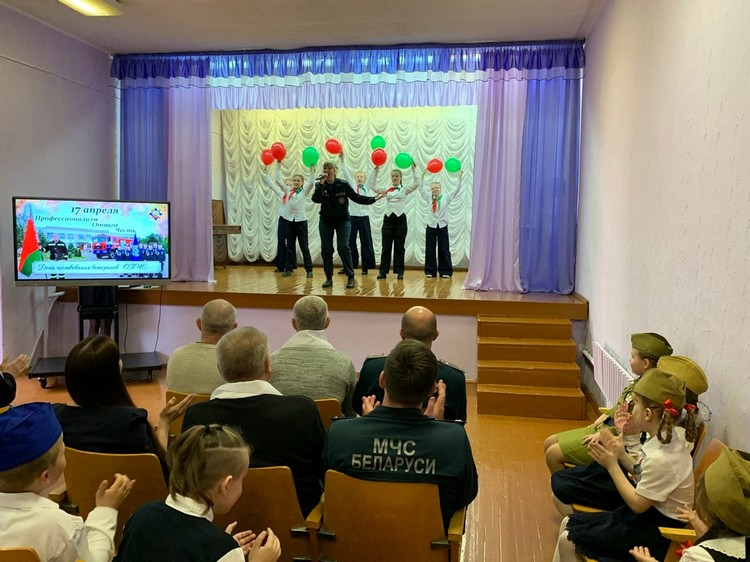 Далее наши ветераны посетили Долголесскую среднюю школу Гомельского района, где их с нетерпением уже ждали ребята. Под бурные овации герои вошли в актовый зал школы. Ученики подготовили для виновников торжества тематическую концертную программу с участием спасателей.