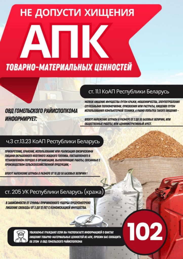 Основная задача сотрудников органов внутренних дел в период проведения уборочной и заготовительной кампаний — обеспечить сохранность урожая, горюче-смазочных материалов и других ценностей сельскохозяйственных предприятий.