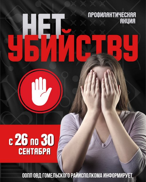 С 26 по 30 сентября на территории Гомельского района пройдет профилактическая акция «Нет убийству», направленная на снижение числа тяжких и особо тяжких преступлений, сообщили в ОВД Гомельского райисполкома.