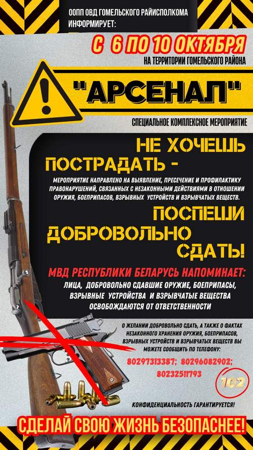 С 6 по 10 октября на территории Гомельского района состоится основной этап специального комплексного мероприятия «АРСЕНАЛ». Акция направлена на предупреждение и пресечение правонарушений, связанных с незаконным оборотом оружия, сообщили в ОВД Гомельского райисполкома.